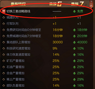比如V6升级V7之后,就可以有一个较大幅度的提升,可以获得4星谭雅,免费切换三套战略路线,大家都知道,切换一次战略需要200金币,洗一次战略点也需要200金币或者20W联盟贡献,代价特别之大!但是到了V7之后,一起都变了,3战略天赋随意切,战略天赋技能随意用,简直爽的飞上了天,没有体力了切辅助加30体力;然后要偷袭对方家,赶紧切战争战略让自己的第一次攻击无死亡去打伤对面的基地;之后发现升级科技的时候资源缺少,点了一下发展的5小时资源强制收取,这感觉简直不能自已了,让小编觉得,VIP7才是真正游戏体验的开始。
